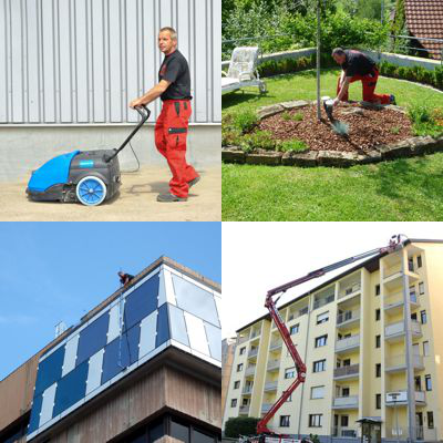 24-Stunden-Notdienst, Hausmeisterdienst, Technische Betreuung / Kontrolldienste, Reparaturdienste, Grünanlagenpflege, Gehweg- und Grundstücksreinigung, Winterdienst, Tiefgaragenreinigung, Doppelparkerreinigung, Dachrinnenreinigung, Kaugummientfernung, Tiefgaragenreinigung, Gravurdienste, Treppenhausreinigung, Glasreinigung, Jalousienreinigung, Fassadenreinigung, Teppichreinigung, Grund- sowie Sonderreinigung.